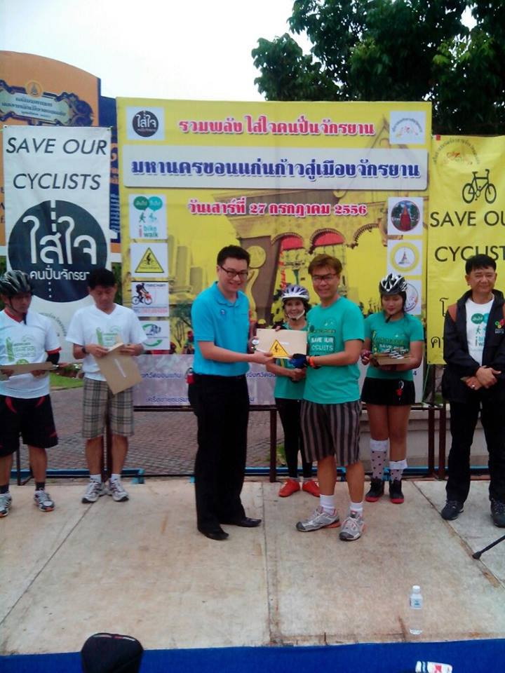 ประธานชมรมจักรยานจังหวัดขอนแก่น คุณสุรพงศ์ ใจเมือง และเครือข่ายฯ 41 กลุ่ม ประกอบด้วยสมาชิกกว่า 800 คน จากหลากหลายกลุ่มอาชีพ ทั้งผู้บริหาร และผู้นำองค์กรสำคัญๆ สังกัดอยู่ในกลุ่มด้วย ซึ่งช่วยให้สร้างสานความเข้าใจในวัตถุประสงค์และแนวทางการดำเนินงานเครือ ข่ายฯ ได้ดียิ่งขึ้น สามารถขับเคลื่อนกิจกรรมเครือข่ายฯ เพื่อสนับสนุนการใช้จักรยานในชีวิตประจำวันให้เป็นไปอย่างคึกคักและมีประสิทธิภาพ นอกจากนี้ เครือข่ายฯ เริ่มเห็นความสำคัญของการมีข้อมูลทางวิชาการ จึงได้มีการสำรวจและศึกษาสถานการณ์การใช้จักรยานในชีวิตประจำวันของชาวขอนแก่น ผลการสำรวจสามารถนำข้อมูลมาประมวลและสรุป จัดทำเป็นข้อเสนอแนะต่อหน่วยงานรัฐ และท้องถิ่น ดังนี้