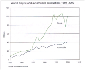 กราฟแสดงการผลิตจักรยานและรถยนต์ทั่วโลก ในช่วงห้าสิบปีระหว่าง 1950 – 2000 (แหล่งข้อมูล: Worldwatch Institute)